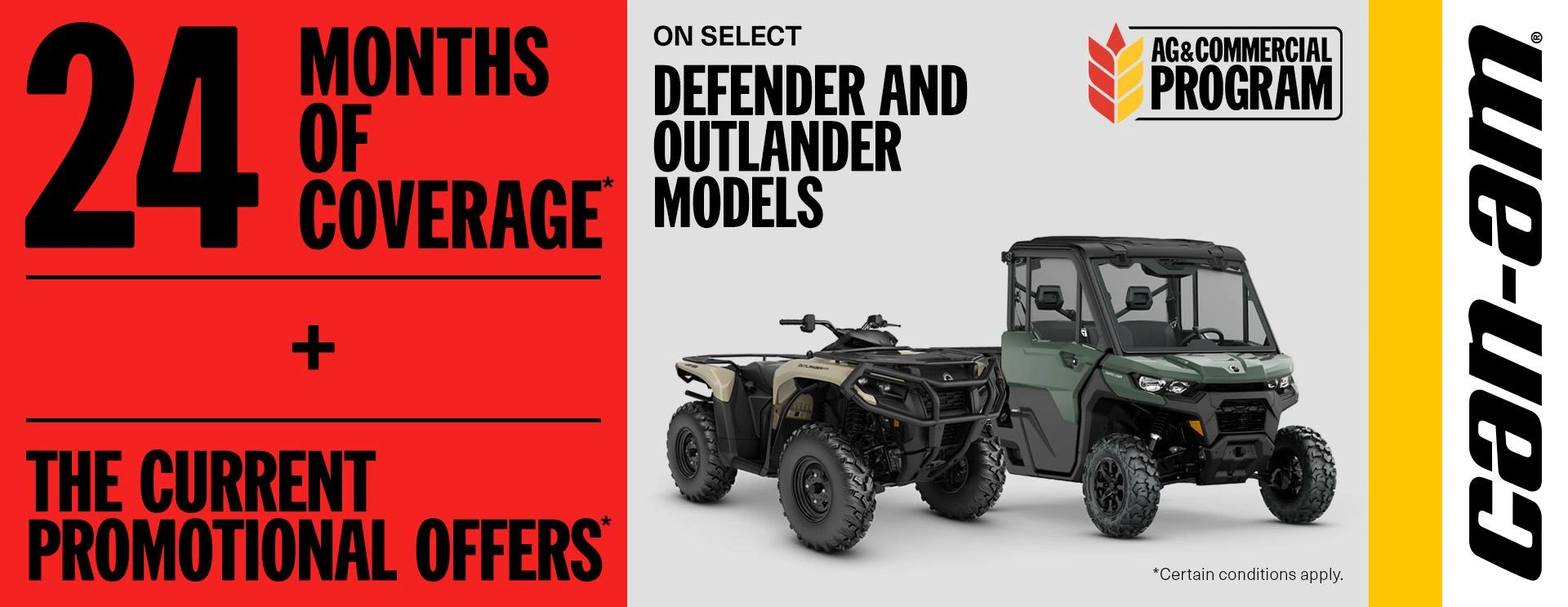 Get an 24 months of coverage + rebates off select Can-Am Defender, and Outlander models.